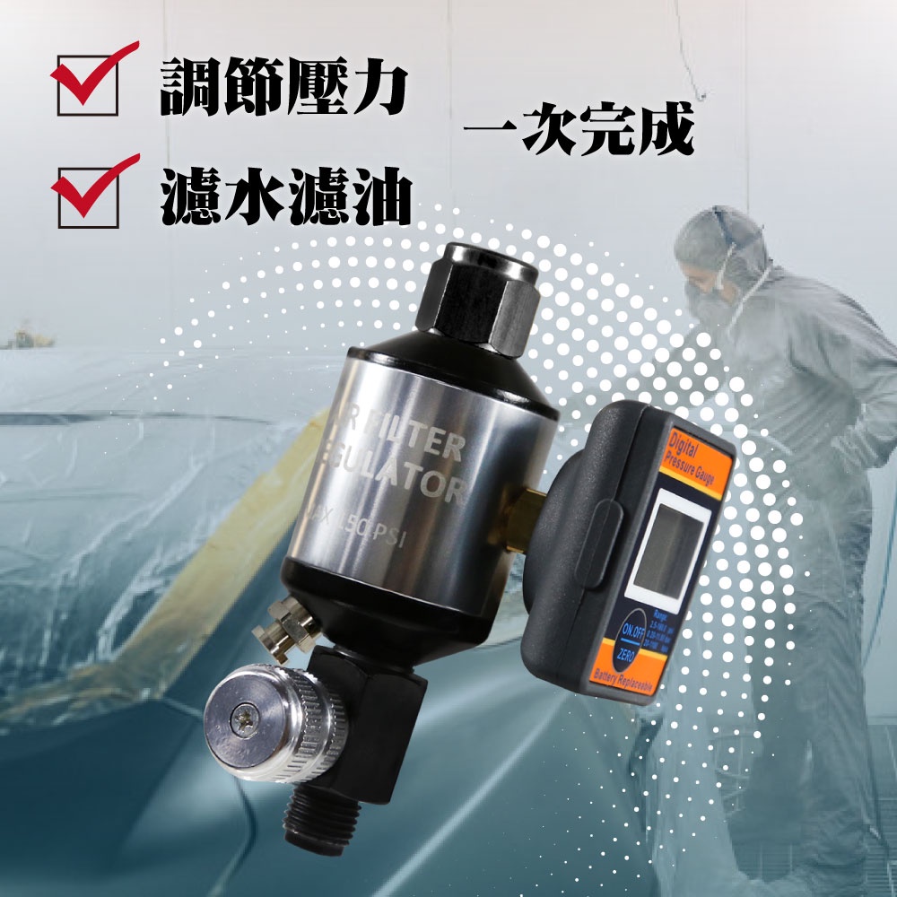 1.高效率油水分離濾水器, 適合噴槍/噴漆槍/氣動工具等, 過濾氣壓中額外的水分, 確保噴塗效果與其他工具發揮最大效益.