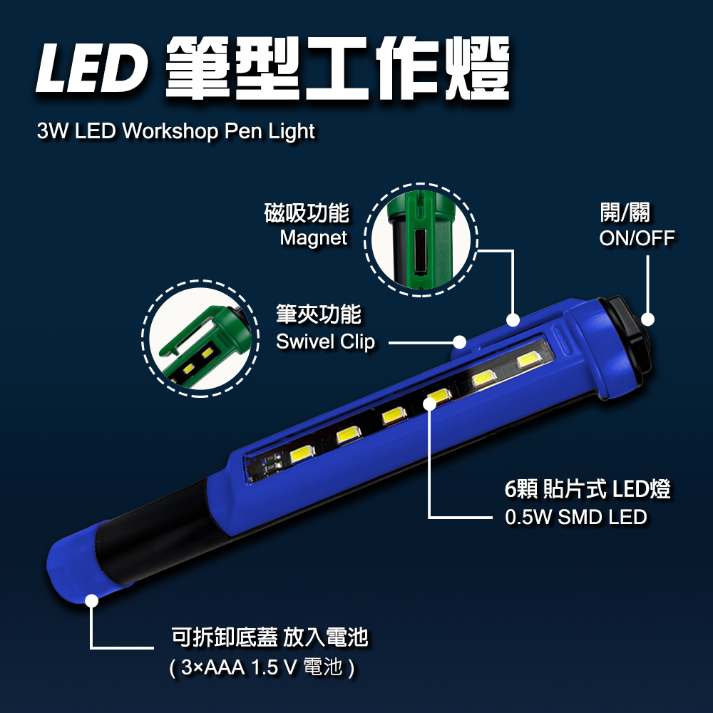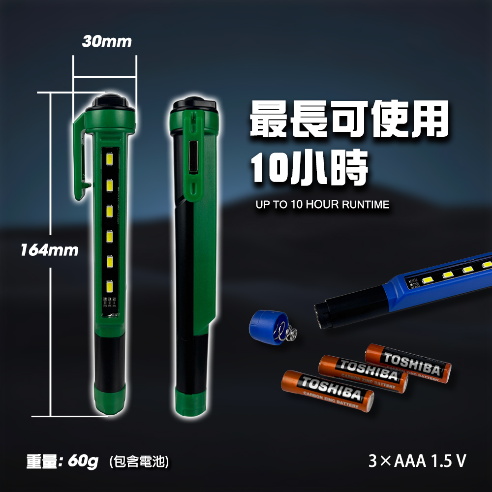 LE-PL3 (3W輕巧款) | 6顆 × 0.5W LED | 3×AAA 1.5V 電池 | 3W | 聚光照明,便攜型 | 164mm × 30mm / 60g(含電池) | 磁吸底座、旋轉筆夾 |